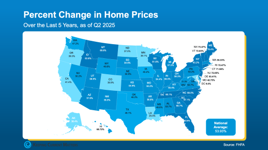 According to the Federal Housing Finance Agency (FHFA), home prices have jumped by nearly 54% nationwide over the last five years (see map below):