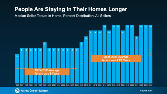 Data from the National Association of Realtors (NAR), shows the average homeowner stays in their home for about 10 years now (see graph below):